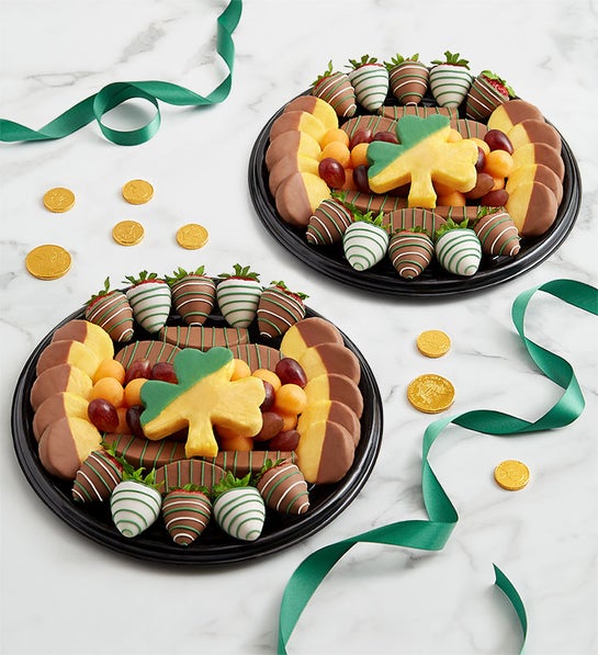 This fanciful fruit-filled platter is the perfect addition to any St. Patrick’s Day celebration. Chocolate-dipped strawberries and apple wedges, melon balls, grapes, and more bring color and sweetness, and the 12” platters add a shamrock-shape pineapple slice half-dipped in chocolate for more fun.
